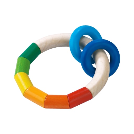 Erste Spielzeuge für Babys müssen nicht immer extravagant sein. Der HABA-Greifling Kringelringel ist ein echter Klassiker, denn er vereint eine einfache Kreisform mit kunterbunten Farben. Der ungefärbte Bogen ist fest und lässt sich auch von kleinen Händchen leicht greifen. Die regenbogenbunten Holzelemente sind beweglich auf ein strapazierfähiges Band gefädelt und können hin- und herbewegt werden. Dazu kommen noch zwei blaue Kunststoffringe, die munter klappern, wenn man den Greifling schüttelt. Die unterschiedlichen Farben und Effekte regen das Kind zum Greifen und Entdecken an.