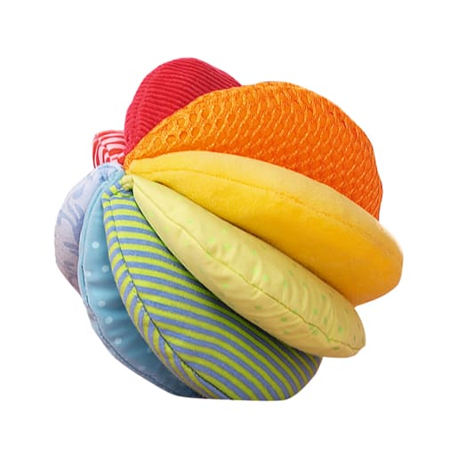 Hier leuchten alle Farben des Regenbogens, wenn der Ball über den Boden kullert. Gleichzeitig können Babys mit den Händen unterschiedliche Stoffe erkunden. Material: Baumwolle/Polyester, Velours, Netzgewebe, Cord, Trikotgewebe. Maße: Ø 15 cm. Von HABA.
