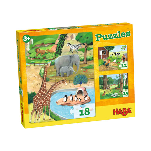 Willkommen in der Welt der Tiere: Ob Bauernhof, Zoo oder Wald – kleine Puzzle-Fans kommen hier voll auf ihre Kosten. Die drei HABA-Puzzles Welt der Tiere haben bei gleicher Größe unterschiedliche Schwierigkeitsstufen (12, 15 und 18 Teile). So haben Kinder nicht nur immer wieder Abwechslung beim Zusammensetzen der Puzzles, sondern üben Stück für Stück auch ihre motorischen Fähigkeit. Außerdem lernen die Kleinen mit den Puzzles viele Tiere und ihren Lebensraum besser kennen.