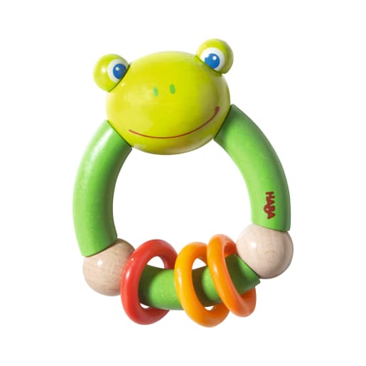 Ist er nicht süß, der kleine Greifling Quakefrosch? Seine fröhlichen, leuchtenden Farben regen kleine Kinder zum Spielen an. Wird der HABA-Greifling geschüttelt, klappern die drei Kunststoffringe lustig. Die einzelnen Holzelemente sind auf ein reißfestes Polyesterband gefädelt und lassen sich so auch bewegen. Durch die unterschiedlichen Materialien, Farben, Formen und Geräusche bietet der HABA-Greifling Quakefrosch allen Babys immer wieder neue Reize und fördert sie so in ihrer Entwicklung. Das trainiert aber nicht nur ihre Motorik und ihre Sinne, das macht auch noch einen Heidenspaß. Denn das ist bei jedem Spielzeug die Hauptsache!