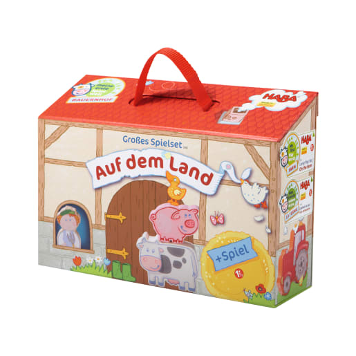 Auf einem Bauernhof ist immer etwas los – genau wie beim großen Spielset „Auf dem Land“ von HABA. Bauer Tim muss seine Tiere auf dem Bauernhof füttern und die Kuh muss auch noch gemolken werden. Mit dem Spielset „Auf dem Land“ kommt keine Langeweile auf. Neben der Figur Bauer Tim gibt es noch 8 Tiere, 1 Traktor, 1 Futtertrog für die Tiere, 2 Strohballen, 2 Büsche, 3 Bäume und 3 Zäune. Die liebevoll gestalteten Holzfiguren lassen sich leicht greifen und regen zu Rollenspielen an. Außerdem enthält das Spielset noch ein zusätzliches Bauernhof-Spiel mit Anleitung. Und der Clou: Das Transport-Köfferchen aus extrastarkem Karton ist zugleich bespielbarer Bauernhof!