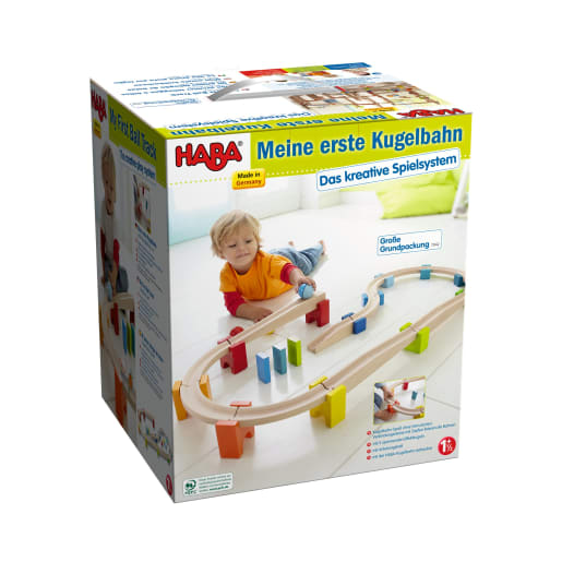 Hier geht’s rund für alle Kleinkinder: Denn Meine erste Kugelbahn von HABA bietet Bauspaß und Kullervergnügen ohne Verrutschen! Die farbigen Verbindungssteine haben Zapfen, die leicht in Löcher an der Unterseite der Kugelbahnteile einrasten. So wird das Bauen zum Kinderspiel und die Bahn ist schön stabil, auch wenn die kleinen Baumeister mal dran stoßen. Toll sind die drei spannenden Effektkugeln, die beim Rollen glitzern oder klingeln. Werden die Baumeister größer, kann die erste Kugelbahn problemlos mit allen Packungen von Meine erste Kugelbahn oder den klassischen HABA-Kugelbahn-Sets erweitert werden.
