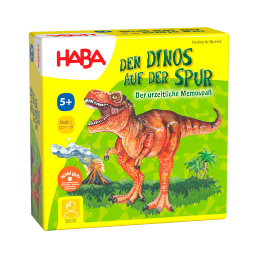 Den Dinos auf der Spur ist ein spannendes Memo-Spiel von HABA. Weil im Dschungel Dinos gesichtet wurden, machen sich alle Spieler auf den Weg, um sie mit eigenen Augen zu sehen. Doch es ist gar nicht so einfach, die gewaltigen Urzeittiere zu Gesicht zu bekommen. Welcher Forscher schafft es, die gesuchten Dinos nacheinander aufzudecken und als Erster das Ziel zu erreichen? Die Suchkarten zeigen die Dinos, die unter den Dinokarten gesucht werden müssen. Zeigen sich auf beiden Karten die gleichen Dinos, darf die Holzfigur auf der Laufstrecke einen Fußabdruck vorgezogen werden. Doch aufgepasst! Der Weg zum Ziel ist nicht ohne Hindernisse.