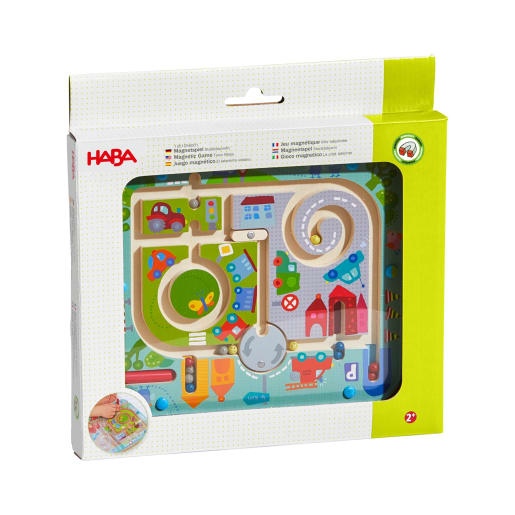 Beim Magnetspiel Stadtlabyrinth von HABA sind kleine Verkehrspolizisten gefragt: Die farbigen Kugeln sollen mit dem Magnetstab durch die Stadt auf die farblich passenden Parkplätze bewegt werden. Dabei ist in der Stadt ganz schön viel los. Wer darf zuerst durch den Kreisverkehr? Mit der Drehscheibe lässt sich das einfach regeln und mit dem Schiebestein eine Straße sperren. Wo kann man abbiegen und wie geht der Weg weiter? Aber Achtung! In der Stadt dürfen die Kugeln nicht zu schnell „fahren“, sonst geht der Kontakt zum Magnetstift verloren und man muss von vorne beginnen. So wird spielerisch Konzentration und Feinmotorik trainiert.
