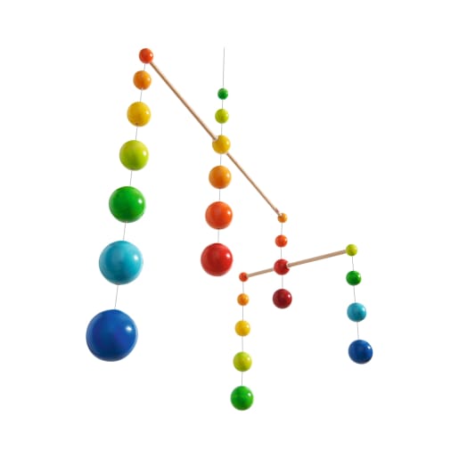 Mit dem HABA-Mobile Regenbogenbälle hält ein farbharmonisches Designstück Einzug ins Kinderzimmer. Bunte Holzkugeln in den unterschiedlichsten Größen hängen am Mobile: die kleinsten oben, die größten unten, jede Reihe farblich sortiert von hell nach dunkel. Im Luftzug tanzen die Kugeln sanft hin und her und haben eine angenehme, beruhigende Wirkung. Daher ist die Wickelkommode oder das Gitterbett der ideale Einsatzort für das HABA-Mobile Regenbogenbälle, dessen Holzkugeln in sämtlichen Regenbogenfarben leuchten – ein wunderschöner Anblick, der nicht nur Kinder, sondern auch Eltern erfreut.