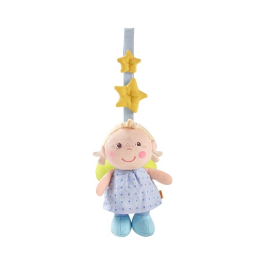 Ein treuer Gefährte von Anfang an ist die Hängefigur Schutzengelchen in Blau. Mit seiner kecken Frisur, dem niedlichen Kleidchen und zwei goldenen Sternlein scheint es geradewegs vom Himmel herbeigeeilt zu sein. Dank einer Länge von 25,5 cm lässt es sich jederzeit an Kinderwagen oder Babyschale fixieren und regt zum Betrachten, Greifen und Spielen an. Am Bettchen befestigt, bewacht die Hängefigur Schutzengelchen auch den Schlaf seiner kleinen Schützlinge und zaubert eine himmlische Stimmung ins Kinderzimmer. Als persönlicher Glücksbringer ist sie das ideale Geschenk zur Geburt oder Taufe!