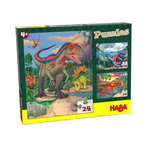 Ganz schön gefährlich sehen sie aus, die riesigen Dinosaurier, die einst die Erde unsicher machten. Doch echte Dino-Fans schreckt das nicht. Sie lieben die imposanten Urzeittiere mit dem feurigen Blick, den spitzen Zähnen, den Panzern, Schuppen oder Flügeln. Mit den drei HABA-Puzzles aus je 24 stabilen Kartonteilen kommen kleine Saurier-Kenner voll auf ihre Kosten. Und wenn fertig gepuzzelt ist, bieten die farbstarken und detailreichen Motive jede Menge Spannendes zu entdecken.