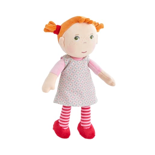 Die Kuschelpuppen von HABA erobern die Herzen ihrer Puppeneltern sofort. Dank weicher Füllung und kuscheligem Stoff lassen sie sich super Liebhaben und Schmusen. Sie sind ein idealer Begleiter für die ganze Baby- und Kleinkindzeit und ein schönes Geschenk für alle Puppenmamas und -papas. Ihre Kleidung kann dank Klettverschluss an- und ausgezogen werden. Die Schuhe sind fest vernäht. Und nach 30 °C in der Waschmaschine sehen die Lieblingspuppen auch nach vielen gemeinsamen Erlebnissen noch schön aus. So wie die Kuschelpuppe Roya: Mit zwei feschen Zöpfen, süßem Pony und dem hübschen Outfit mit Ringelstrumpfhose und zart gemustertem Kleid ist sie genauso pfiffig wie ihre Puppeneltern.