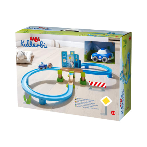 Auf der Spielbahn Polizei-Verfolgungsjagd von HABA sind Spannung und Action angesagt! Die Polizeiwache schlägt Alarm: Rudi Räuber ist mal wieder aus dem Gefängnis ausgebüxt und treibt sein Unwesen. Doch zum Glück ist ihm die Polizei sofort auf den Fersen, denn das Auto besitzt einen flotten Schwungmotor. Zudem bringen 2 Universal-Steilkurven ordentlich Tempo auf die Straßen. Die HABA-Spielbahn Polizei-Verfolgungsjagd lässt sich schnell aufbauen. Verbindungselemente sorgen dabei für maximale Stabilität am Boden und versprechen lange Spielfreude. Auf der Kulisse „Stadt bei Nacht“ können junge Kugelbahnfans ab 2 Jahren viele liebevoll gestaltete Details entdecken.