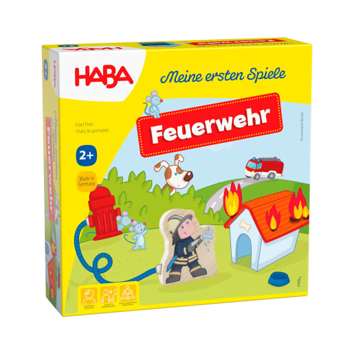 Die HABA-Spielereihe Meine ersten Spiele fordert Kinder ab 2 Jahren vielseitig: Zuerst entdecken die Kinder die Farben und Formen der Materialien und Illustrationen im freien Spiel. Anschließend werden sie mit ersten einfachen Regeln dazu angeleitet ganz bestimmte Dinge zu tun. Das macht ihnen viel Spaß, fördert sie spielerisch und hat verschiedene Lerneffekte. Das HABA-Spiel Feuerwehr aus der Reihe Meine ersten Spiele ist besonders aufregend, denn die Feuerwehrmänner müssen einen Brand in Habahausen löschen: Vor dem Einsatz machen sich die Spieler mit den Ausrüstungs-Gegenständen der Feuerwehr vertraut. Dann ist ein gutes Gedächtnis gefragt: Wer findet Eimer, Feuerlöscher und Schlauch im Feuerwehrauto, um alle Brände zu löschen? Ein kooperatives Memospiel.
