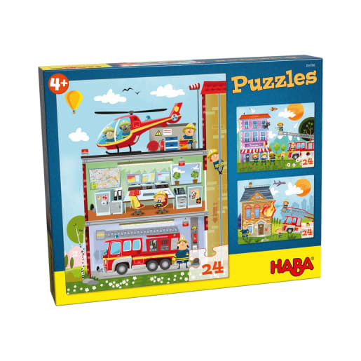 Die Puzzles Kleine Feuerwehr von HABA bereiten Kindern ab 4 Jahren großes Puzzlevergnügen. Die Packung enthält 3 spannende Motive aus der gleichnamigen Erfolgs-App „Kleine Feuerwehr“ von Fox & Sheep. Die Kinderpuzzles bestehen aus je 24 Teilen, die sich von Kinderhänden gut greifen lassen und verschiedene Szenen aus dem Alltag einer Feuerwehrstation zeigen. Für kleine Puzzlefans gibt es auf jedem Motiv eine Menge zu entdecken. Die Puzzles Kleine Feuerwehr von HABA bieten Kindern eine sinnvolle Beschäftigung, denn Puzzeln schult sowohl die Feinmotorik als auch die Auge-Hand-Koordination. Da alle Puzzleteile aus stabiler Pappe verarbeitet sind, ist langer Spielspaß garantiert.