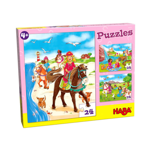 Die Puzzles Pferdefreundinnen von HABA bereiten Kindern ab 4 Jahren großes Puzzlevergnügen. Die Packung enthält 3 wunderschöne Motive. Für kleine Puzzlefans gibt es auf jedem Motiv eine Menge zu entdecken: Hier reiten die Pferdefreundinnen am Strand entlang, da picknicken sie nahe dem Wasserfall und dort machen sie mit ihren Pferden Rast am Fluss. Die Kinderpuzzles bestehen aus je 24 Teilen, die sich von Kinderhänden gut greifen lassen. Die Puzzles Pferdefreundinnen von HABA bieten Kindern eine sinnvolle Beschäftigung, denn Puzzeln schult sowohl die Feinmotorik als auch die Auge-Hand-Koordination. Da alle Puzzleteile aus stabiler Pappe verarbeitet sind, ist langer Spielspaß garantiert.