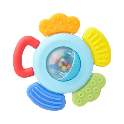 Babys lieben es, Dinge mit allen Sinnen zu erkunden. Dabei spielen gerade in den ersten Lebensmonaten der Geschmackssinn bzw. die Zunge und der Mundraum eine große Rolle. Eltern wissen: Ihre Babys stecken sich alles Mögliche in den Mund und kauen genüsslich darauf herum. Der putzige HABA-Greifling Stern aus Silikon lädt mit seinen fünf Armen zu einer spaßigen Entdeckungstour ein. Jeder Arm des Sterns besitzt eine anders strukturierte Oberfläche: Mal ist er mit vielen kleinen Punkten, mal mit dünnen oder breiten Streifen oder mit Kringeln überzogen. Das Kauen auf den unterschiedlichen Strukturen bietet somit viel Abwechslung. Es entspannt und beruhigt, vor allem beim Zahnen. Der HABA-Grefiling Stern ist für Babys daher ein äußerst nützlicher Helfer!