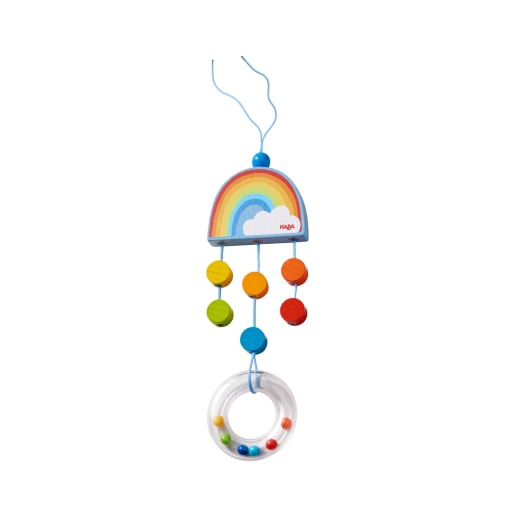 Die Farben des Regenbogens bringen Kinder zum Strahlen! Die bunten Kugeln der Hängefigur sind sowohl am Regenbogen und als auch im Greifring integriert, sodass sie sich bei Berührung lustig bewegen. Die Hängefigur bringt Babys lange Freude und ermuntert sie zum Greifen.