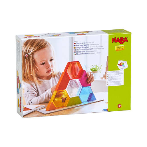 Das Stapelspiel Farbkristalle von HABA bietet alles für langandauerndes Stapelvergnügen. Die 14 farbenfrohen, vielseitig geformten Prismen lassen sich in zahlreichen Varianten in den Stapelrahmen einordnen und aufbauen. 12 doppelseitig bedruckten Vorlagekarten in 3 Schwierigkeitsstufen geben dafür immer wieder neue Anregungen. Die großen Teile sind schon von kleinen Stapelkünstlern ab 3 Jahren gut zu greifen. Ihre halbtransparente Optik ist besonders spannend und macht immer wieder Lust auf neue Stapelversuche. Dabei trainieren die Kinder ihre Feinmotorik, ihre Konzentration sowie ihre Kreativität.