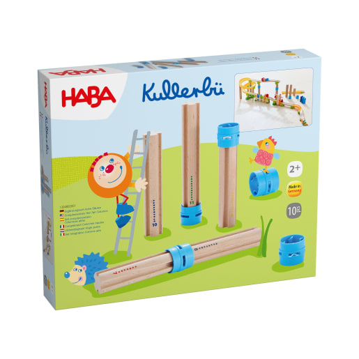Alle Kullerbü-Spielbahnen von HABA lassen sich mit tollen Ergänzungssets kombinieren. Das Ergänzungsset Hohe Säulen bringt dabei viel Höhe ins Spiel und verleiht den Kugeln richtigen Schwung. Der Aufbau einer Kullerlandschaft ist damit kinderleicht: Dank der blauen Verbindungsmanschetten lassen sich jeweils zwei Säulen zu einer hohen Säule miteinander verbinden. Auf den Säulen befinden sich Ziffern und Mengenpunkte als Höhenangabe. Je höher die Ziffer bzw. je mehr Punkte sich auf einer Säule befinden, desto höher ist diese. Steckt man nun eine dunkelgrüne Basis, eine Säule und einen hellgrünen Verbinder zusammen, entsteht ein stabiler Träger für Rampen, Geraden und Kurven. Mit dem Kullerbü ¬– Ergänzungsset Höhe Säulen von HABA lässt sich die Kullerbü-Spielwelt nach Herzenslust erweitern!