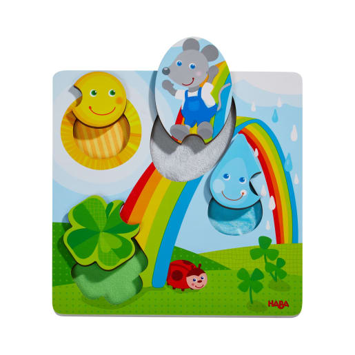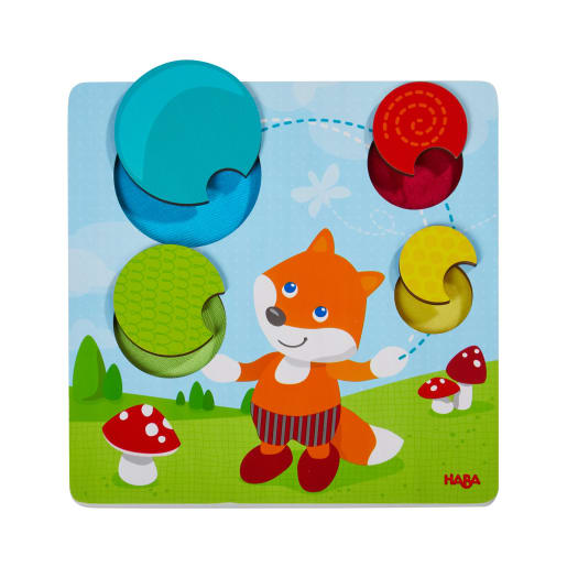 Fröhlich jongliert der Fuchs mit vier unterschiedlich großen Bällen in verschiedenen Farben. Doch, was ist jeweils unter den Bällen versteckt? Das finden bereits die Jüngsten ab 12 Monaten heraus, indem sie in die kleinen Öffnungen greifen und die 4 Puzzleteile aus dem Bild herausnehmen. Zum Vorschein kommen dann verschiedene Stoffe. So ertasten Kinder mit dem HABA Fühlpuzzle Fuchs die Unterschiede zwischen glatten und rauen Oberflächen. Ganz nebenbei trainiert das Fühlpuzzle die Zuordnung von Formen und Farben. Das HABA Fühlpuzzle Fuchs ist daher ein tolles Geschenk zum ersten Geburtstag.
