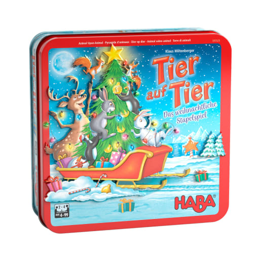 Beim weihnachtlichen Stapelspiel Tier auf Tier stellen sich die Tiere zu einer immer höher werdenden Weihnachtspyramide auf. Aber wer steht ganz oben? Das liegt in der Hand der Spieler: Sie stapeln Eichhörnchen, Schneehasen, Pinguine und Elche aufeinander. Mit viel Fingerspitzengefühl werden die Tiere auf Sterne, Tannen und Schlitten gesetzt. Wer als Erster alle seine Figuren sicher getürmt hat, gewinnt. Die griffigen Holzteile fördern die Feinmotorik. Ganz nebenbei wird das dreidimensionale Denken geschult. Das weihnachtliche Stapelspiel Tier auf Tier von HABA sorgt dank leicht verständlicher Spielregeln für schnellen Spielspaß.