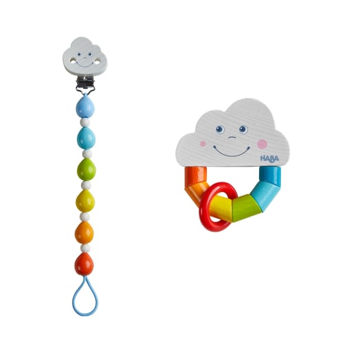 Hier kommt gleich doppelt Freude auf! Das Babygeschenk-Set Regenbogenwelt besteht aus einer Schnullerkette sowie einem Greifling in Regenbogenfarben. Mit ihrem bunten Design bringen die Schnullerkette und der Greifling Babys zum Strahlen und regen zum Staunen und Entdecken an: Der Greifling verbreitet mit seinem fröhlichen Wolkengesicht im Nu gute Laune und klappert auch noch so lustig mit seinem Kunststoffring. Die farbenfrohe Schnullerkette hält den Lieblingsschnuller immer greifbereit und spendet Trost. Daher ist das Babygeschenk-Set Regenbogenwelt von HABA die perfekte Erstausstattung für kleine Regenbogenfreunde.