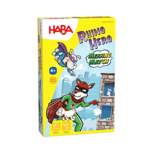 Schau genau und schnapp schnell zu! heißt es bei dem actionreichen HABA Kinderspiel mit Karten-Paaren Rhino Hero – Missing Match. Der Schurke lässt Runde für Runde einen Zwilling seiner Wahl verschwinden. Die Spieler helfen Rhino Hero, indem sie die Karten genau beobachten und herausfinden, welcher Zwilling vermisst wird. Alle spielen gleichzeitig. Also, schnell sein und Karte schnappen! Wer die meisten Zwillingspaare vereint, gewinnt das Spiel für Kinder ab 4 Jahren. Mit vielen lustigen Charakteren und im handlichen Mitbring-Format lädt das Schnappspiel immer wieder und überall zu heldenhaftem Spielvergnügen ein.