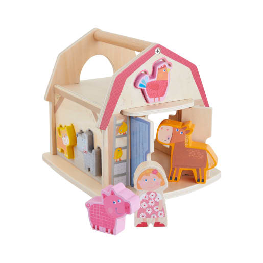 Die Sortierbox Bauernhof von HABA ist ein Steckhaus in detailreichem Farm-Design. Die sechs Holzfiguren haben unterschiedliche Formen und Farben. Jede von ihnen passt durch genau eine Aussparung in der Scheunenwand. Wo ist der Eingang für die Katze? Begeistert sortieren Kinder ab 1 Jahr die Figuren an den passenden Stellen ins Holzhaus. Dabei üben sie spielerisch das Zuordnen von Formen und genaues Schauen. Durch das bewegliche Scheunentor finden die putzigen Bauernhoftiere wieder ins Freie. Das liebevoll gestaltete Holzspielzeug lädt auch zum freien Spielen ein. Erste Rollenspiele regen zum Erzählen an, fördern Kreativität und Sprachentwicklung. Spielend lernen mit HABA.