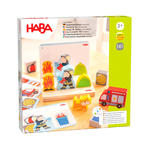 Mit dem Stapelspielzeug Feuerwehr von HABA bauen Kleinkinder vorgegebene Szenen mit den griffigen Holzfiguren nach. Das Stapelbrett hält eine Vorlagenkarte fest. Diese zeigt den Feuerwehrmann, den Einsatzwagen und die anderen Stapel-Elemente in einer bestimmten Anordnung. Kleine Stapelkünstler gestalten auf dem Stapelbrett dieses Bild mit den Holzfiguren nach. Sie stellen die Stapelsteine übereinander, hintereinander und nebeneinander, je nach Schwierigkeitsgrad. Das Lernspiel für Kinder ab 2 Jahren vermittelt altersgerecht räumliches Denken und genaues Schauen. Auch zum freien Spielen sind die detailreichen Spielsteine prima geeignet.
