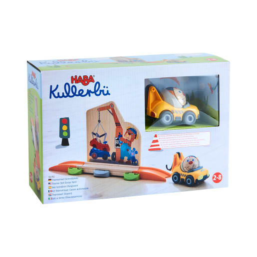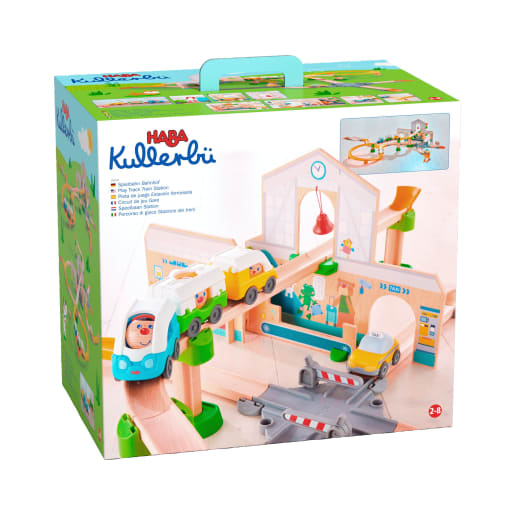 Der Bahnhof für die Kullerbü-Spielbahn von HABA ist eine große Spielkulisse für Kinder ab 2 Jahren. Über die abwechslungsreichen Holzschienen fährt ein moderner Schnellzug. Die drei Waggons lassen sich aufklappen, damit die drei Charakterkugeln ein- und aussteigen können. Lockführer Loris, Dina und Uli sind auf der Reise durch Kullerbü. Das Glöckchen signalisiert ihre Ankunft im Bahnhof. Schnell die Rolltreppe hinunter zum Taxi! Das Kullerbü-Auto mit Schwungmotor ist besonders schnell unterwegs auf der Spielbahn wie auf dem Fußboden. Doch über die Kreuzung darf es nur bei geöffneten Schranken fahren. Mindestens sechs Aufbauvarianten und detailreiche Gestaltung sorgen für Abwechslung und riesen Spielspaß!