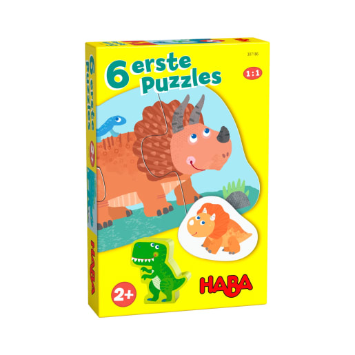 6 erste Puzzles - Dinos von HABA sorgen bereits bei Kindern ab 2 Jahren für jede Menge Spielfreude. Die großen Puzzleteile sind gut von Kinderhänden zu greifen. 2, 3 oder 4 Puzzleteile ergeben im Handumdrehen Tyrannosaurus Rex, Triceratops und 4 weitere starke Dinosaurier aus der Urzeit. 6 erste Puzzles – Dinos von HABA beinhalten außerdem eine Holzfigur zum freien Spielen sowie Plättchen zum Zuordnen: Welches Dino-Baby gehört zu welchem Dino? Da alle Puzzleteile aus stabiler Pappe verarbeitet sind, ist langer Spielspaß garantiert.