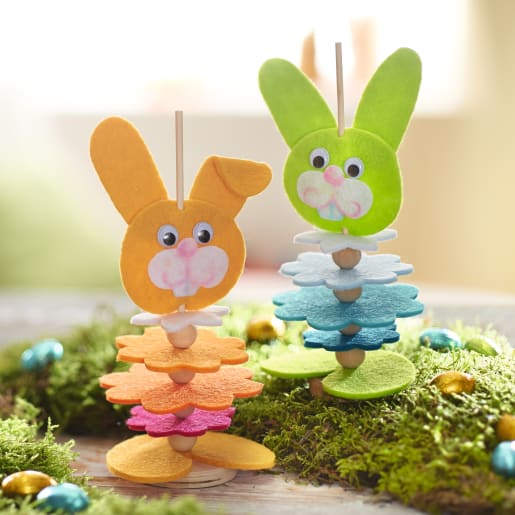Einfach Filzteile und Holzkugeln auf den Rundstab stecken und die Figur mit individuell gestaltetem Hasenkopf abschließen.Inhalt: gelochte Filz-Zuschnitte in verschiedenen Formen und Größen, Rundstäbe, Holzscheiben und -perlen, Wackelaugen, Anleitung. Zum Vergleich: fertiger Hase ca. H 20 cm.