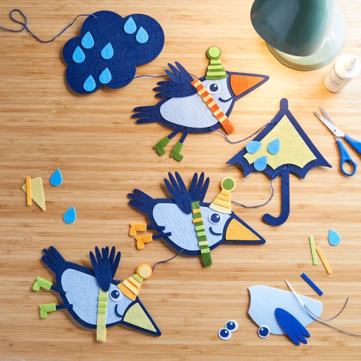 An dieser Filzgirlande baumeln 3 lustige Raben und zeigen, mit der richtigen Kleidung machen auch kühle Herbsttage großen Spaß.Kunststoffnadel und Garn inklusive.Maße zum Vergleich: Rabe ca. 24 x 14 cm groß.