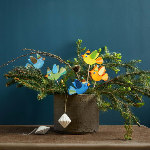 Diese Holzstecker sind schnell gebastelt: Zuerst werden die Holz-Vögel bemalt und verziert, danach mit selbstklebenden Filzelementen geschmückt und zum Schluss auf einen Rundstab gesteckt. Im Handumdrehen ist eine hübsche Vogelschar fertig, die lange für fröhliche Winterstimmung sorgen wird.