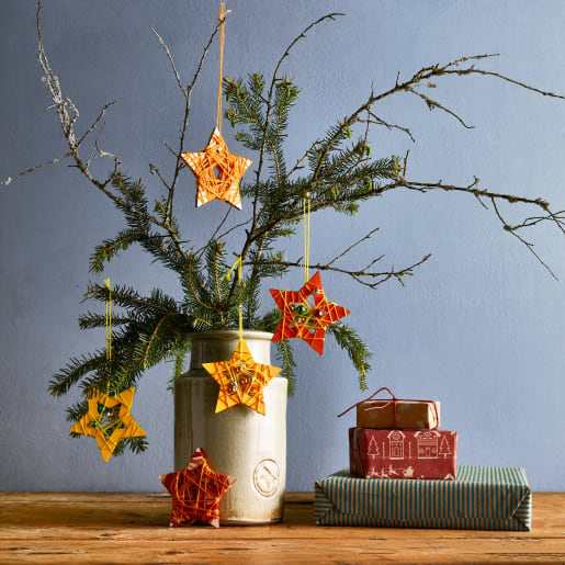 Sterne in allen Variationen sind fester Bestandteil jeder Weihnachtsdekoration. Diese Holz-Sterne müssen erst noch festlich herausgeputzt werden. Das ist ganz einfach. Ein paar bunte Wollreste genügen, um sie weihnachtsfein zu machen. Dabei ist erlaubt, was gefällt und in der Wollrestekiste zu finden ist. Beim Umwickeln kann man verschiedene Farben und Stärken kombinieren und zusätzlich noch Perlen oder Glöckchen mit einarbeiten. Wer mag, kann die Holz-Sterne natürlich auch vor dem Umwickeln grundieren: in Rot oder Grün, Gold oder Silber – ganz nach Belieben.