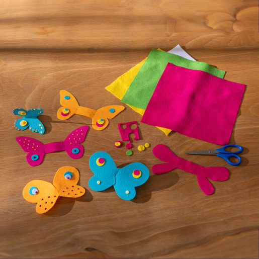 Eine besondere Gattung: Diese Schmetterlinge trägt man wie einen Ring am Finger (passend für Kinderhände). Doch bevor die hübschen Schmetterlinge am Finger durch die Lüfte fliegen, werden sie nach Lust und Laune mit selbstklebenden Filzpunkten und auf Wunsch auch gern mit Perlenmakern oder Glitter Glue verziert. Anschließend einfach zusammenstecken und schon kann losgeflattert werden. Maße zum Vergleich: großer Schmetterling ca. 14 x 9 cm.
