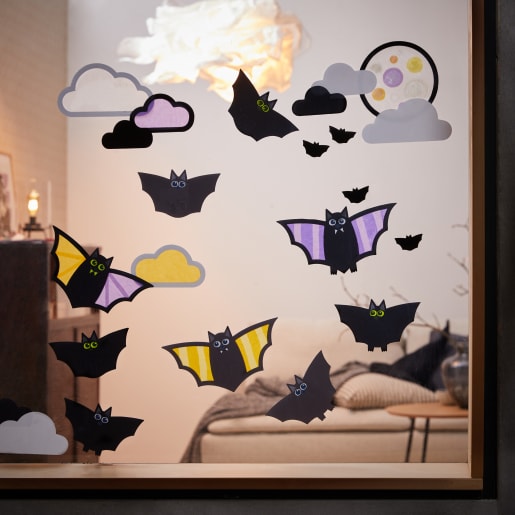 Ein ganzer Schwarm schaurig-schöner Fledermäuse ist die ideale Dekoration zu Halloween. Bevor die Motive an den Fensterscheiben angebracht werden, müssen Einzelteile ausgeschnitten oder herausgetrennt und zusammengeklebt werden. Vielfältige Kombinationsmöglichkeiten!