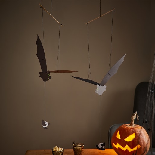 Fledermäuse gehören zu Halloween einfach dazu. Und eine ganz besonders originelle Variante sind die Flatter-Fledermäuse. Sind die Einzelteile ausgeschnitten, gefaltet und verklebt, werden sie an den Rundstäben befestigt und können so sogar mit den Flügeln schlagen.