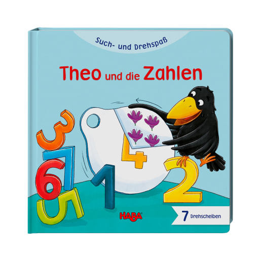 Zählen lernen mit dem Raben Theo ist kinderleicht! In der HABA-Pappbilderbuch-Reihe „Such- und Drehspaß – Theo und…“ lädt Rabe Theo kleine Entdecker ab 2 Jahren dazu ein, Formen, Farben, Zahlen und Gegensätze spielerisch kennenzulernen. Auf jeder Doppelseite gibt es eine hübsche Illustration nach Art eines Wimmelbildes sowie eine einfache Suchaufgabe, deren Lösung mithilfe einer raffinierten Drehscheibe überprüft werden kann. Beim Pappbilderbuch „Such- und Drehspaß – Theo und die Farben“ begeben sich die Kinder auf eine spannende Suche nach den abgebildeten Gegenständen in der richtigen Anzahl.