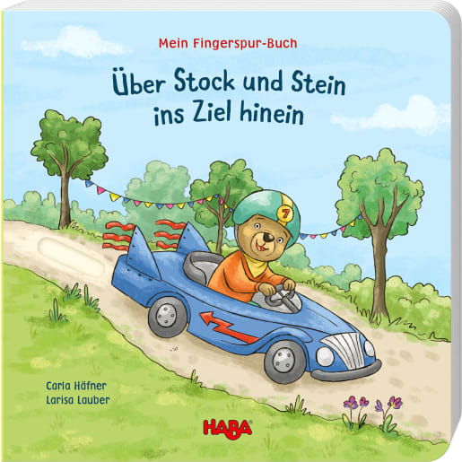 Mit seinem schnellen blauen Flitzer nimmt der kleine Bär an einem Autorennen teil. Wer möchte, kann mit ihm durch den Wald, die Hügel hinauf und hinunter und weiter am Bach entlangfahren und miterleben, ob er wirklich als Erster im Ziel ankommen wird! Das Pappbilderbuch „Über Stock und Stein ins Ziel hinein“ von HABA beinhaltet eine lustig gereimte Geschichte mit farbenfrohen Illustrationen. Etwas ganz Besonderes sind die gestanzten Fingerspuren zum Fühlen, Tasten und Nachspuren: Kinder ab 2 Jahren können mit ihren Fingern auf Entdeckungsreise gehen und nebenbei ihre Feinmotorik trainieren.